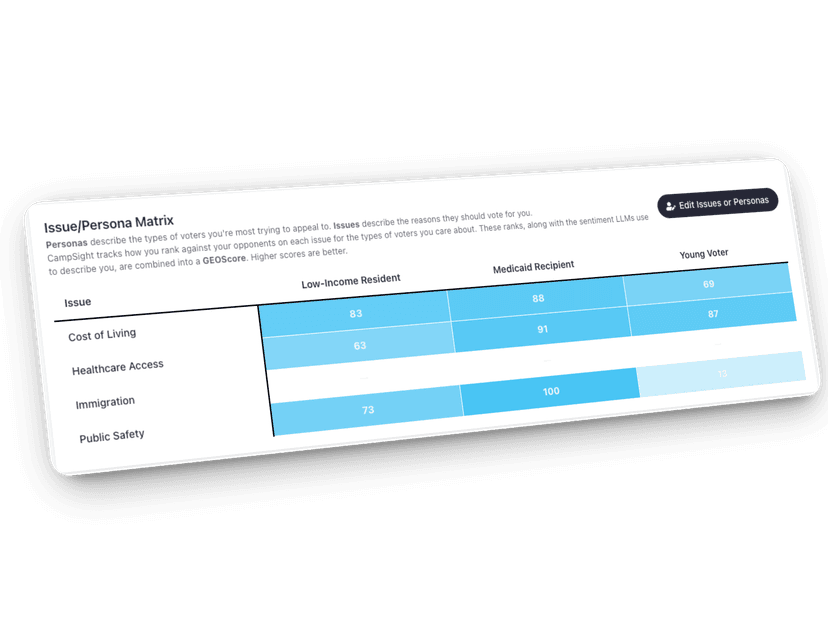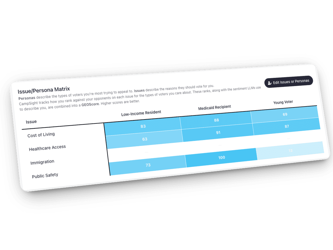 CampSight will identify the voter personas and issues most important to your campaign (you can edit them). We'll regularly compare your site and comms to what AI is saying about you to provide actionable steps to improve your AI presence.