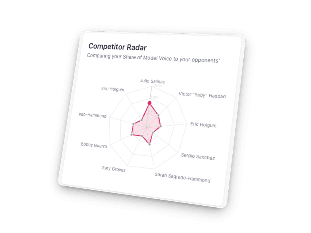 CampSight's GEOScore rolls your rankings, sentiment, and Share of Model Voice into a single daily metric. See if you're gaining ground or bleeding visibility. Benchmark your campaign against others' (including your opponents'!)